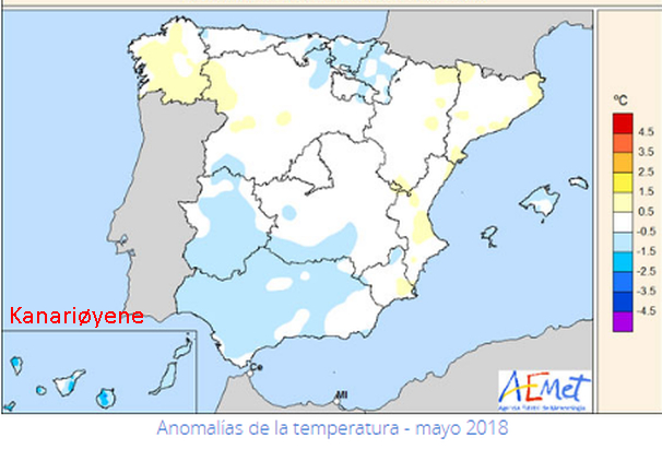 I maj var medeltemperaturen på Kanarieöarna mellan en och två grader under det normala för referensperioden 1981-2010, enligt en månadsrapport som utgivits idag av det nationella väderinstitutet Aemet.